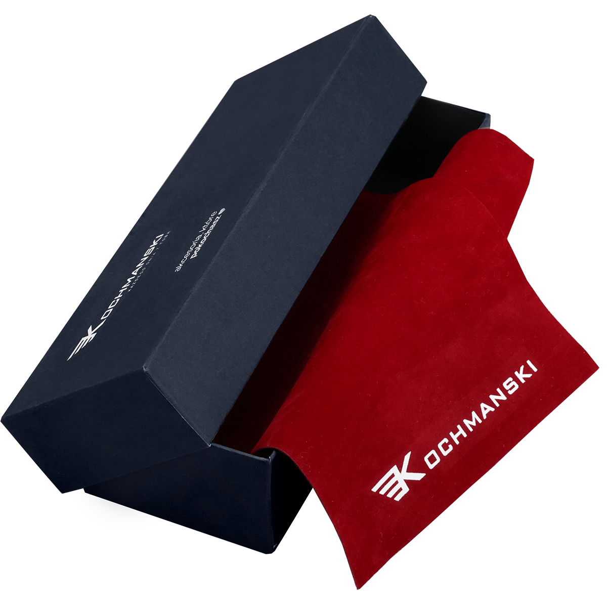 Etui Kochmanski® zapakowane jest w eleganckie, granatowe pudełko, sygnowane logo producenta. W środku znajduje się miękka, aksamitna ściereczka w kolorze czerwonym, która dodaje całości prestiżowego charakteru. Takie opakowanie sprawia, że produkt idealnie nadaje się na prezent - estetyczny, starannie przygotowany i gotowy do wręczenia bez dodatkowego pakowania.